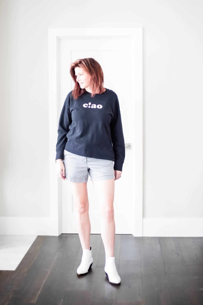 - Shorts and a sweatshirt seems to be my summer uniform at least until mid July when June gloom has long ended and the mornings are no longer wet and grey. The white boots just elevate this outfit from beach bum, ho-hum (definitely not knocking the beach bum. I am a CA Native, you know.) to stylish without much effort. The sweatshirt is from Madewell a couple years ago. The reason this outfit works is that the sweatshirt is fitted not baggy and the shorts are short with a 5″ inseam. I seriously, don’t know what is going on with my hair in this picture. Please ignore.