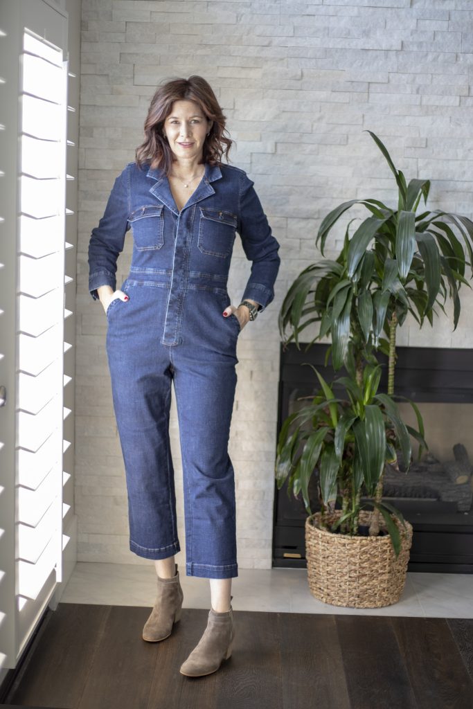 - These Vince booties look great with a shirtdress or jumpsuit. The dress is by Pam & Gela and I love the navy blue with hot pink stripes. Is there anything more simple and comfortable than a good t-shirt dress? I think not. Jumpsuits are another instant outfit. There are so many options on the market right now. This denim jumpsuit is from Madewell and is all kinds of fabulous. It has just a hint of stretch so you don’t feel constricted. The cropped leg works perfectly to show off your favorite booties. I have on my Vince suede booties here because they are so comfortable to walk in but I definitely could see this outfit with more of a statement bootie like the snake print or maybe a bright color.