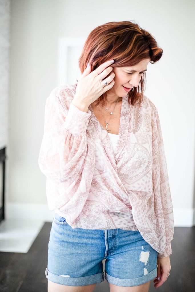 - Kimono tops are perfect with shorts and booties for summer. I love this kimono wrap top from Free People. It is a front tie top which I tied in the back. I love the juxtaposition of the fluid drape of the top with the harder edge of Levi’s shorts and booties. This may be my other summer uniform. I am a huge fan of kimonos to add a little somethin’, somethin’ to your outfit to take it to the next level. Through a kimono over all of your basics for a little something different.