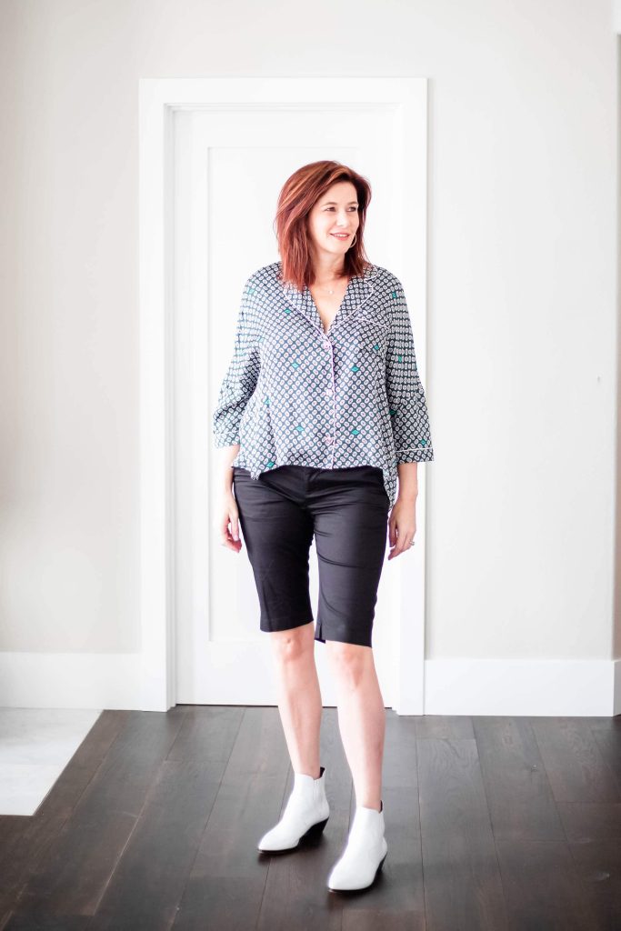 - Ok! The hair is looking better now. Booties look great with long shorts and denim skirts. Bermuda shorts are back in a big way this season. The trick this time around is to find a slim cut pair. I picked these Vince black shorts up at the most recent Shopbop sale. I know I will wear them a ton this summer. They are a lightweight, stretch cotton with a fabulous sheen. I considered the J Brand 811 Bermuda Shorts but ended up with the Vince instead. They can be dressed up or down easier then the J Brand which are a bit more casual. I am wearing with my Maje pajama top and white booties. The whole outfit is effortlessly cool and beyond comfortable.