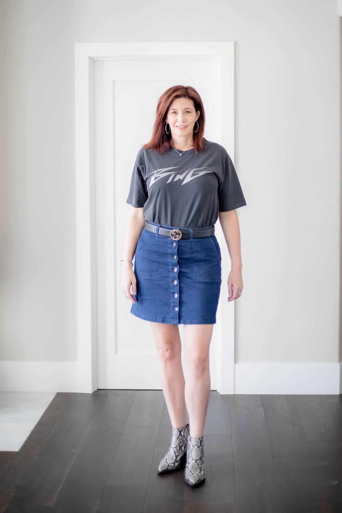 - I paired my Sam Edelman snake print booties with my Madewell button front skirt and Anine Bing Tee. Honestly, I like the Sam Edelman booties better than the Paige and they are significantly cheaper. Anine Bing tees are amazing quality. They are a thick cotton and have that well worn feel. I prefer a good logo tee but you could substitute a band tee for a similar look.