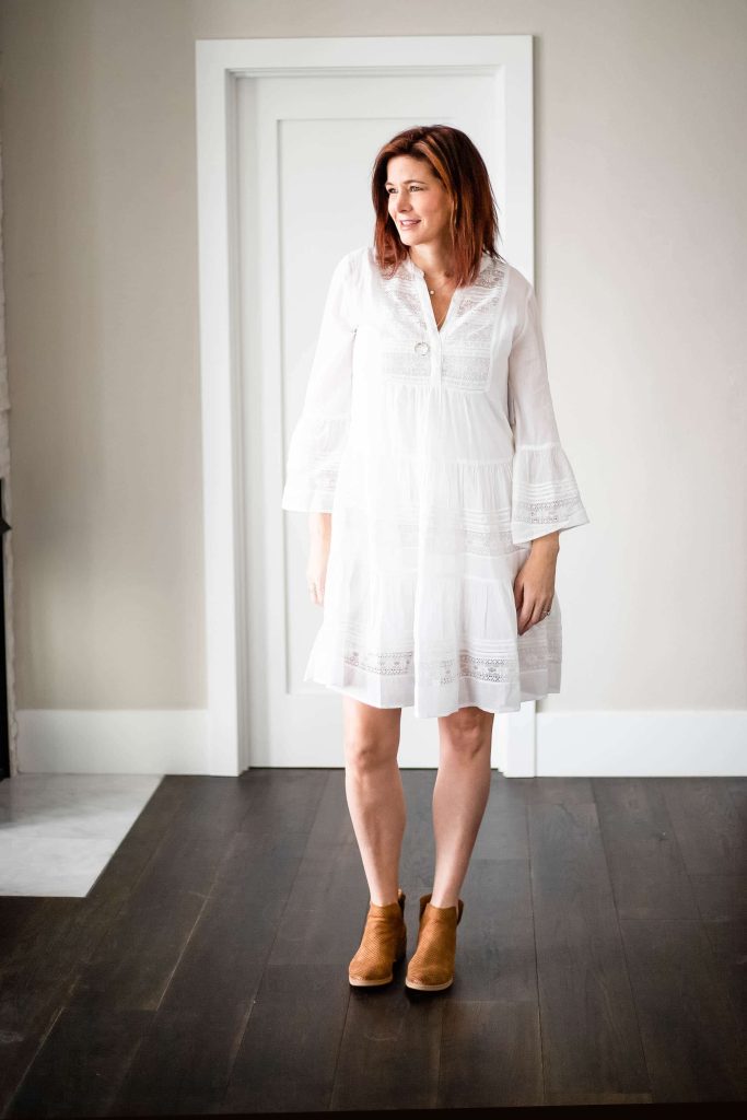 - Tan booties with a white dress. Add a denim jacket for warmth if needed. I added this Earl Jean jacket, I have had for years because it has a tapered cut to balance the loose drape of the white skirt. The dress hemline hits at the skinniest part above my knee and the boots stop long before my calf allowing for my legs to look as long as possible. This outfit would be great for any summer concert festival or dinner out in Cabo.