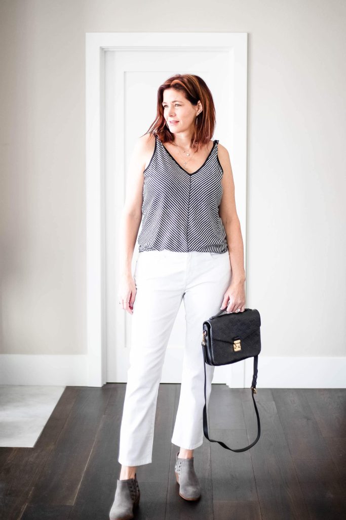 - White denim and booties go together like…peanut butter and jelly. Well, maybe not as perfectly as the beloved, sandwich staple but pretty close. You can pair all your booties with white denim for summer. Here I paired my Current/Elliott boyfriend jeans with this fabulous Paige striped, knot-shoulder top from Anthropologie. This outfit makes me long for warm summer nights.