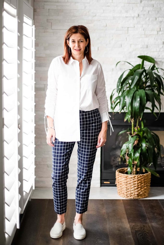 - White Top, Half Tucked with Plaid Pants – I love a good half tuck. It allows you to wear oversized items but gives your waist a little definition. Add sneakers and a denim jacket and you are ready for anything. I bring a jacket with me everywhere in the summer. Do you? All public places seem to way over air-condition and restaurants, theatres and stores are freezing in the summer. I wish they would just stick with the energy efficient guidelines and set their thermostat to 72 regardless of the weather.