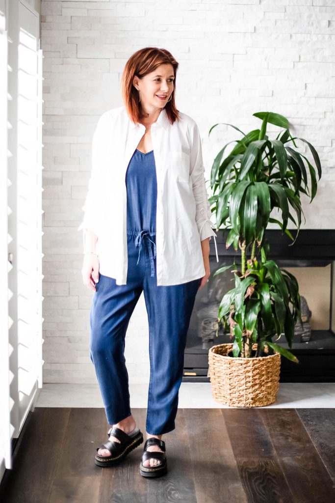 - White Shirt Over a Denim Jumpsuit – This Paige denim dark chambray jumpsuit is sleeveless. It has got to be downright hot for me to wear a sleeveless top. Honestly, most summer days in San Diego are pretty mild. The downright hot days come in Sept, Oct and Nov. I added the white top over it for a spring look. Knot the ends of the shirt for a little something different. The jumpsuit is from a few years ago but this one is similar and with a modern wide leg. My shoes are the Dr. Martens Ryker sandal and I know I will be wearing them all summer long.