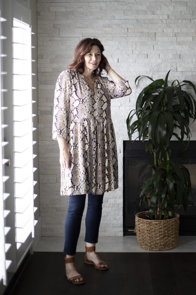 I also paired this dress with jeans. I am not really a big fan of jeans under dresses. Who really can pull off the added bulk but a super model? But, this dress is almost a tunic style and it just works. Add sandals for summer or a camel car coat for warmth and you are ready to go. I am wearing some old Level 99 side zip, flat front denim cropped pants to keep from adding bulk in my tummy area. I think this helps keep the silhouette slim instead of bulky.