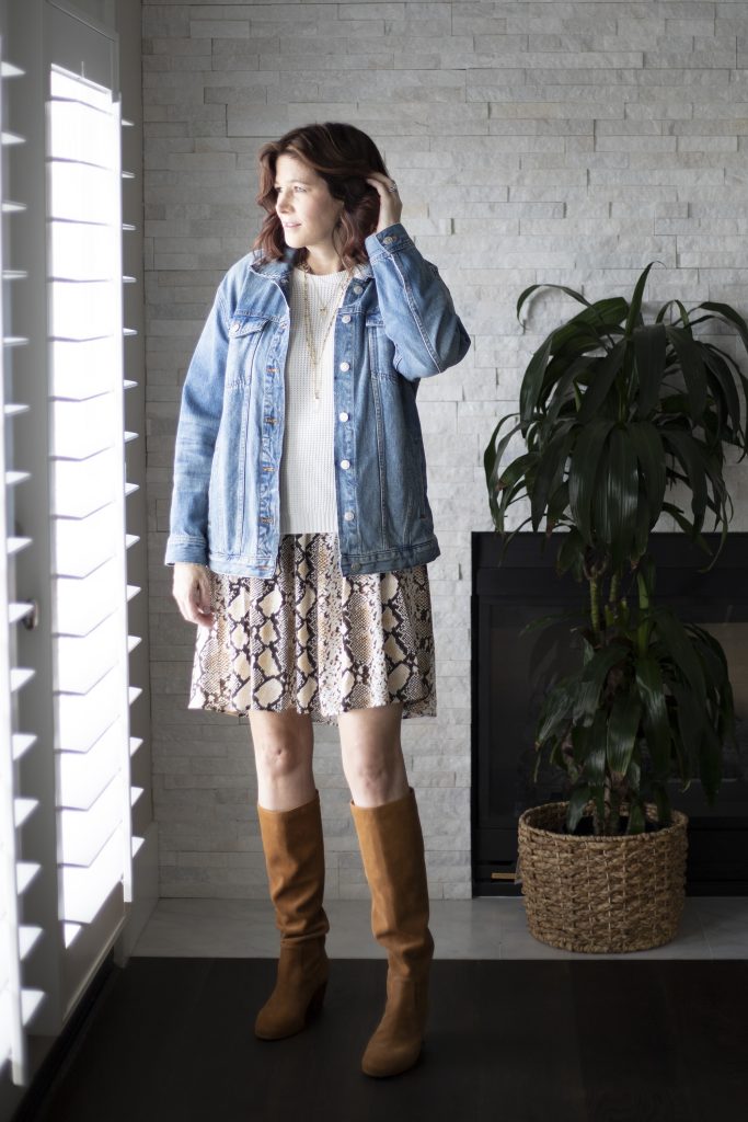 This dress can easily be worn during the cool spring season. First, I paired it with a chunky cream sweater, my Madewell Oversized Denim Jacket and Michael Kors brown suede boots. Next, I topped the dress with a J.Crew Sophie Open Front Sweater-Blazer. Both outfits will keep me sufficiently warm for spring and the layers can easily be removed as needed if by surprise we end up with a warm spring day. (Here’s hoping for warm spring days soon!)