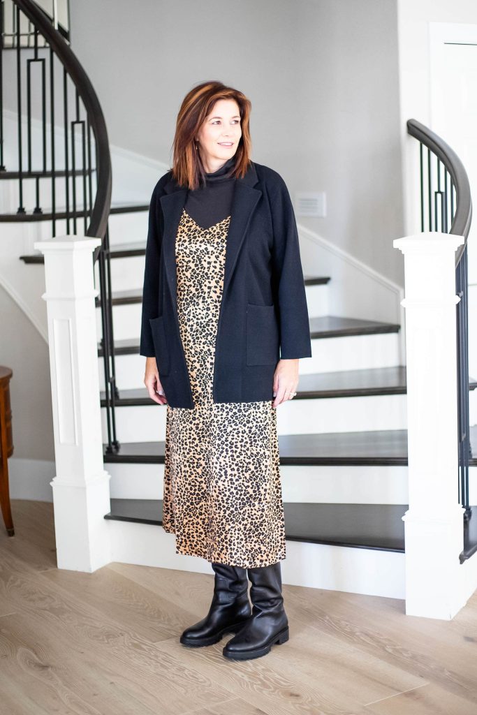 - You can add just about anything under this slip dress to change up the look. For cooler weather, I will add a black turtleneck and a versatile sweater jacket. Both are from J.Crew. The boots are Tamara Mellon and they are perfect with midi skirts and jeans. I am so happy I splurged on these boots. They are perfect!
