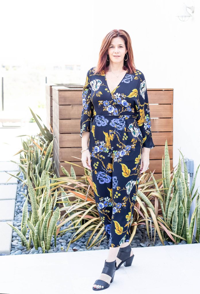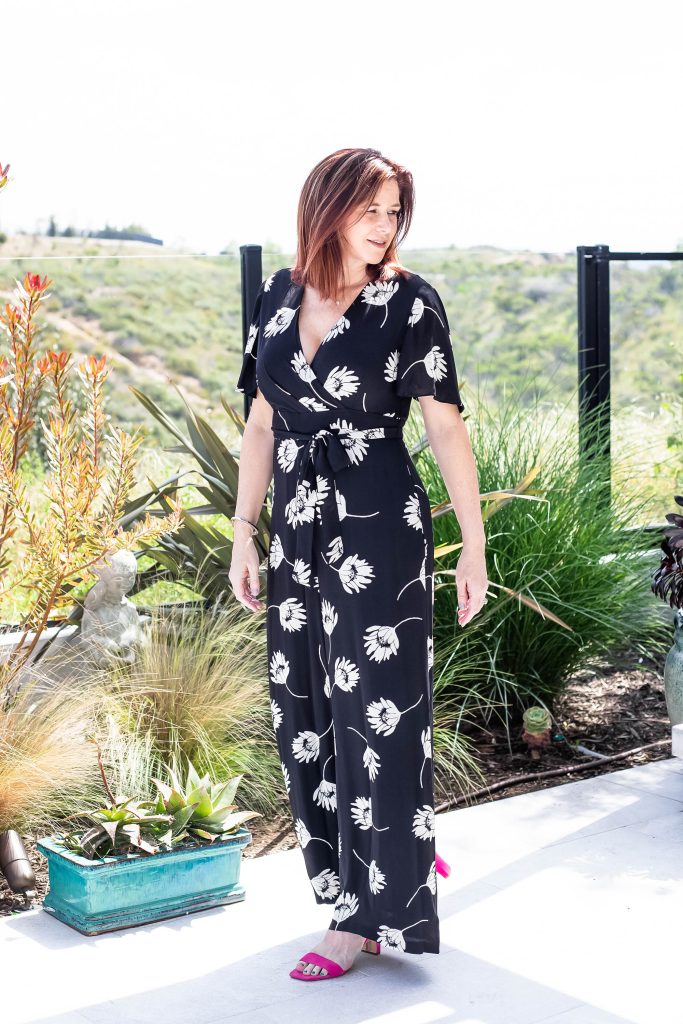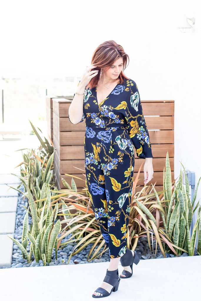This is another London based designer and another jumpsuit. I find their clothes to be on the more conservative side for me. They have some amazing structured dresses and work attire. If modesty is your jam then Hobbs may be perfect brand for you. Hobbs clothing is so well made, I wanted to find more items to try. I spotted this jumpsuit first and it lured me in. Of course, for some reason the salesperson was overly pushy which drives me crazy. I don’t need items suggested to me. I know what I like and will look with my own eyes for what I want to try on. Ok! Rant over. I love the simple white flowers on this wide leg jumpsuit. The sleeve length is perfect and the silhouette is super flattering. And low and behold, the jumpsuit is long enough! I added a pop of color with my shoes.