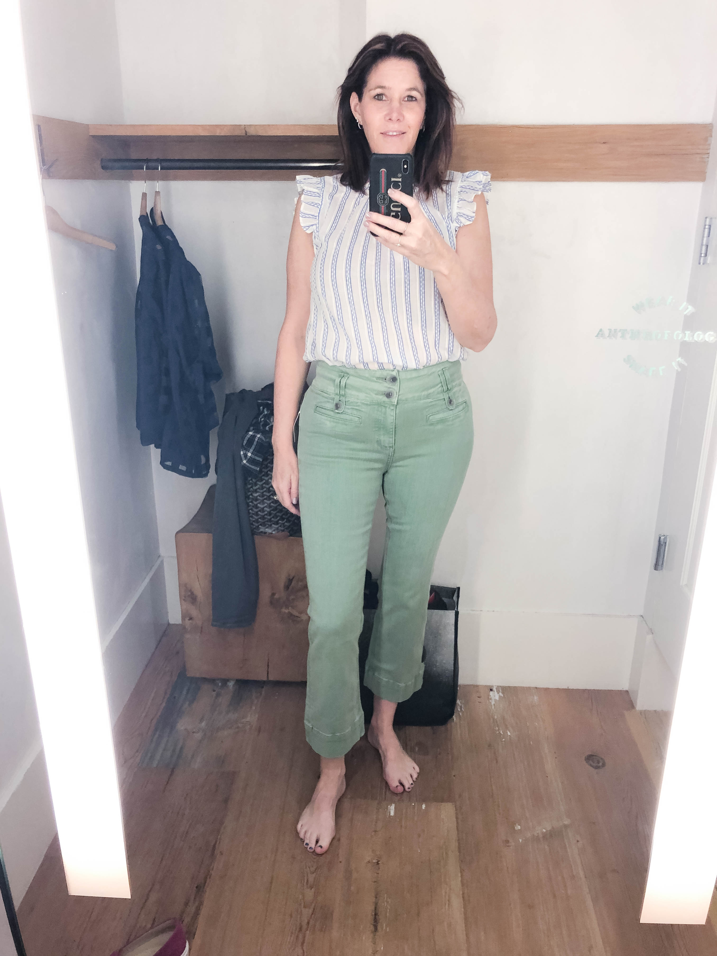 Clearly today, I was drawn to the wide leg pants. I wanted to compare the Madewell version to the Anthropologie version. The mint color is TDF. I personally prefer the clean line of the Madewell Emmett Crop pair but I like the width of the bottom of the Anthro pair. I am wearing the 28 and I am torn whether or not to size up. The pants have a good bit of stretch and I feel like the 28 will be ok after a few hours of wear.