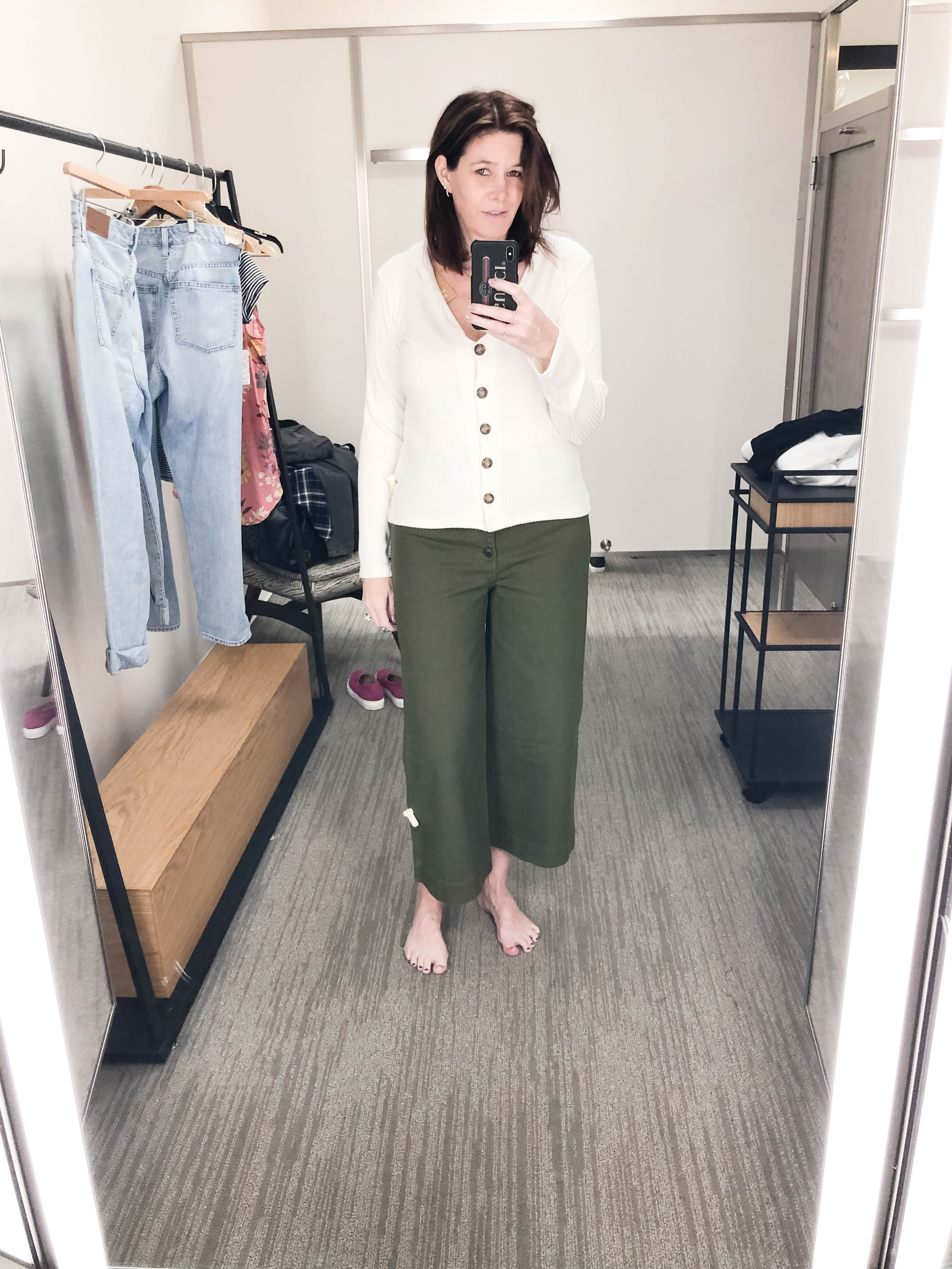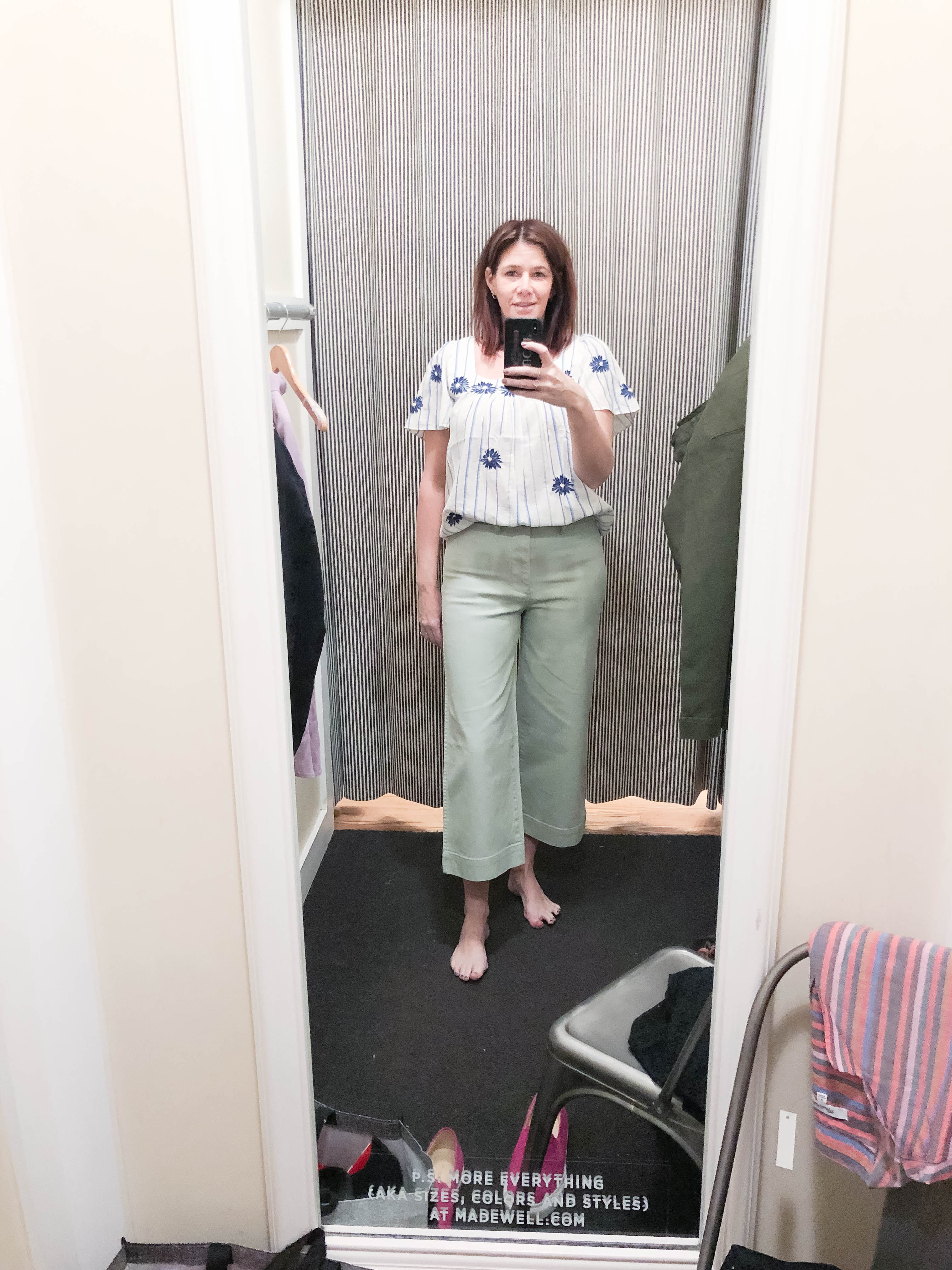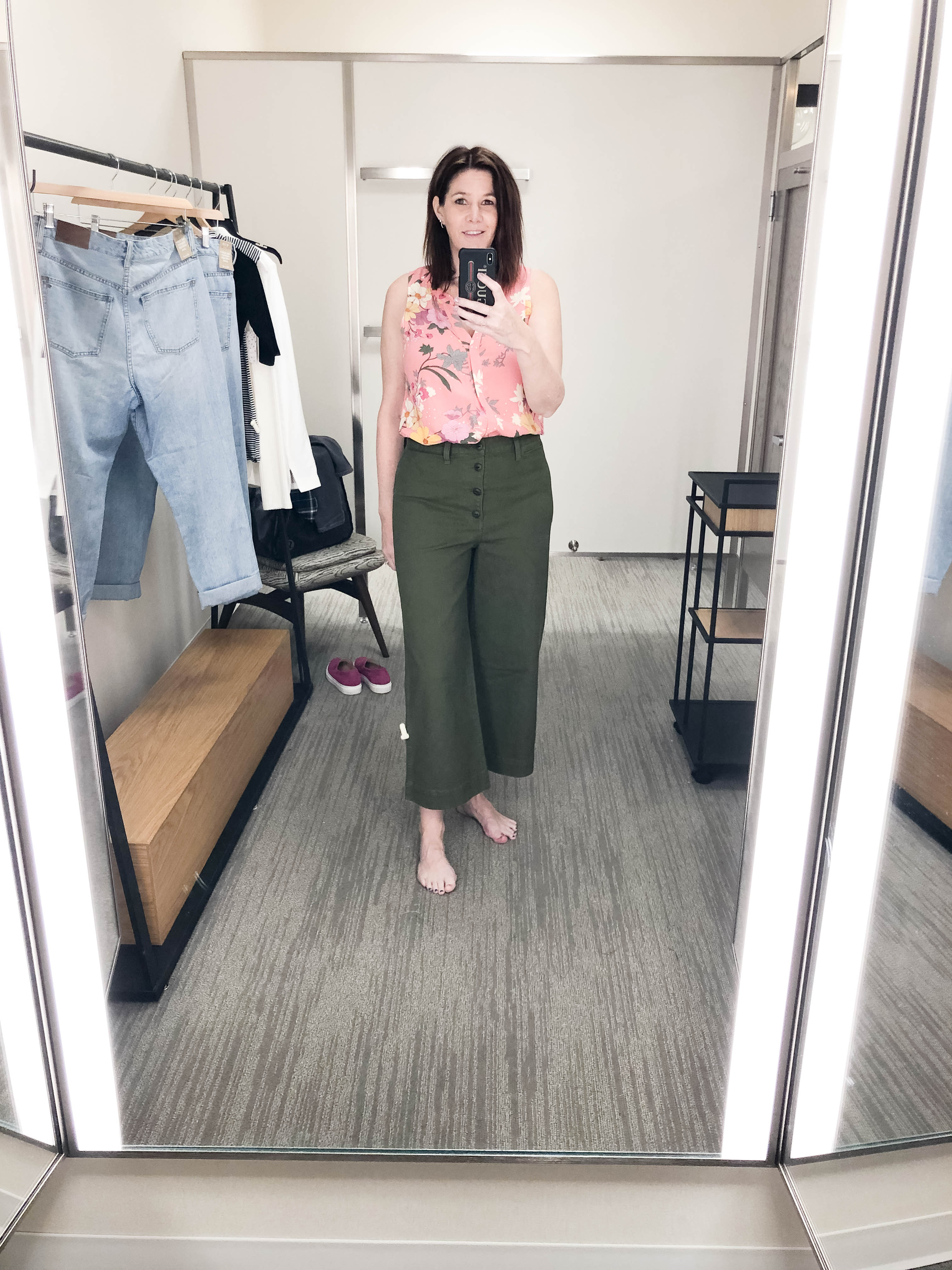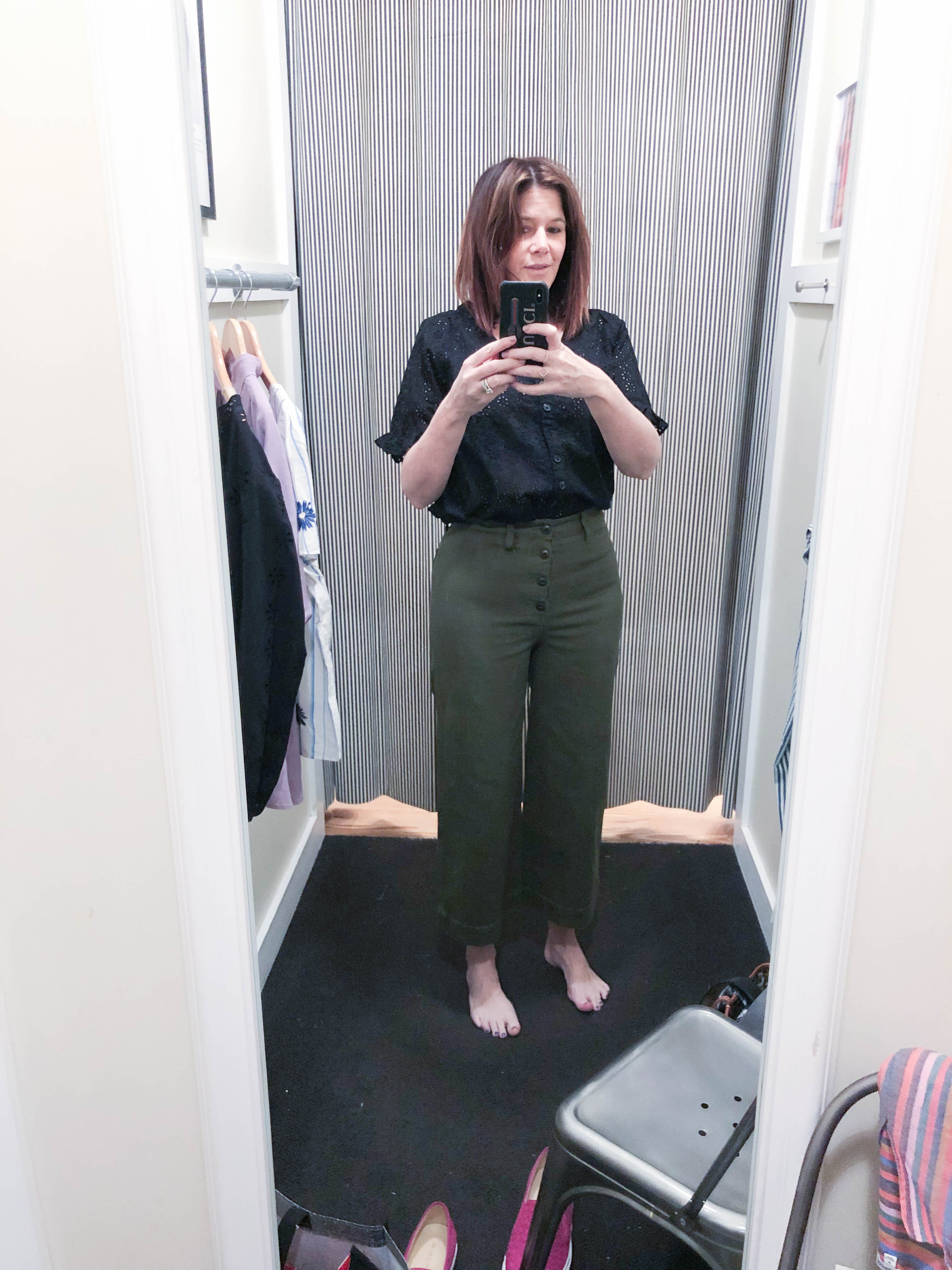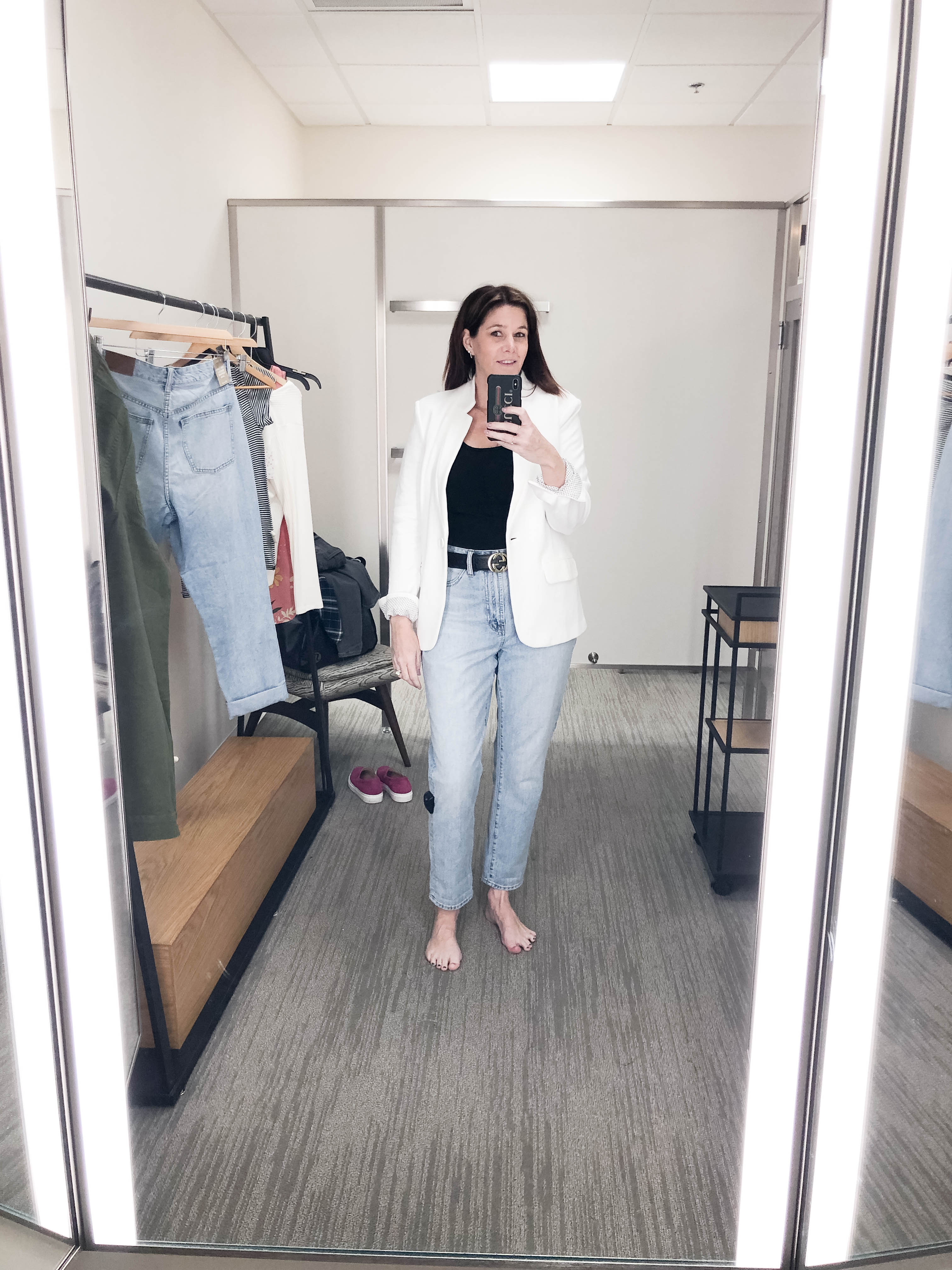 In the end, I went home with the Gibson white blazer and black Reformation top from Nordstrom. I also picked up the eyelet button front top from Madewell. Make sure to check out their sale. It ends tonight! Thanks for reading my first ever edition of Dressing Room Diaries. Next time, I will try and remember to wear a little lipstick so I don’t look like a zombie in the dreaded dressing room lighting. Check out my oversized jeans picks here. Bye, for now!