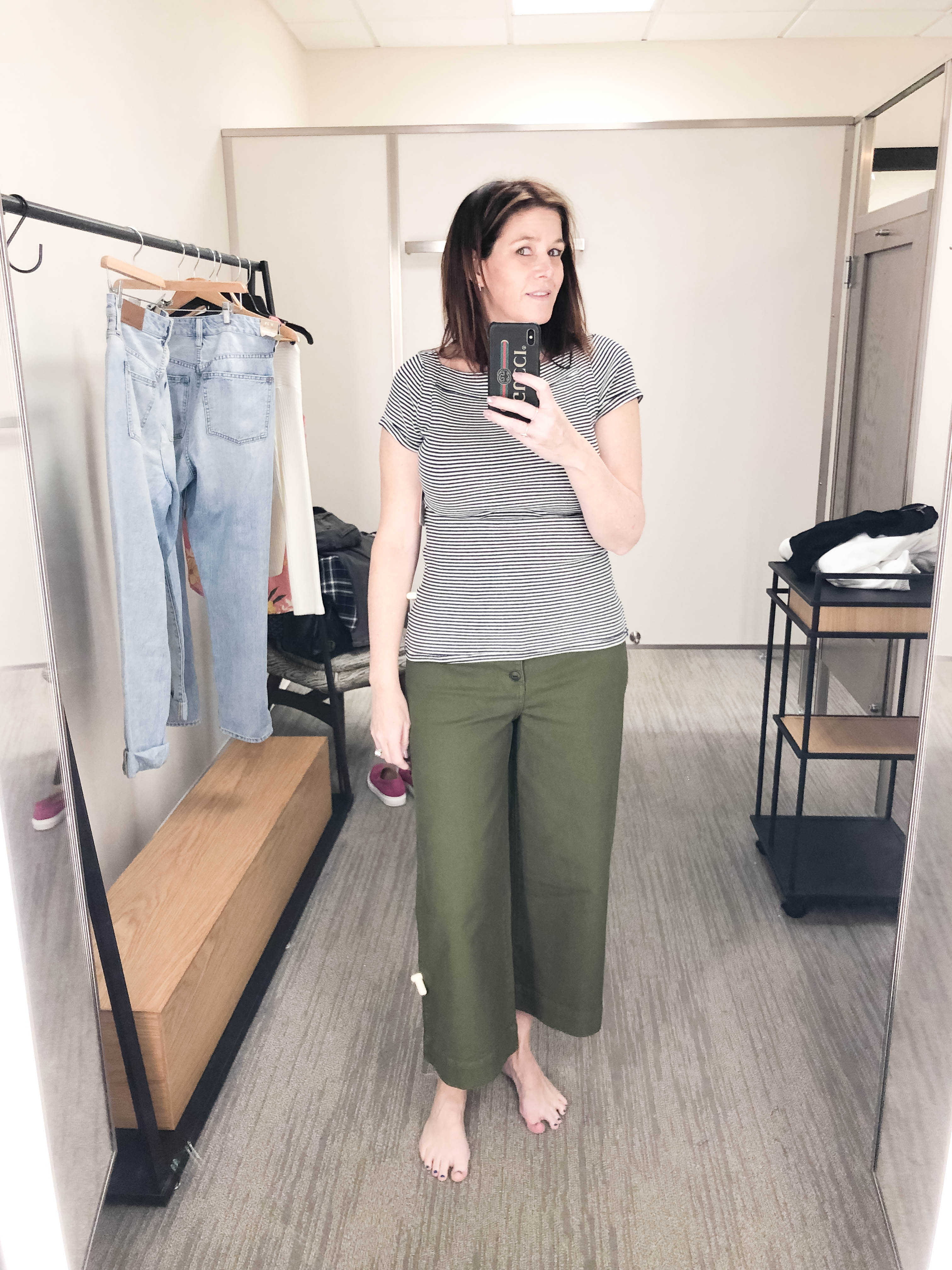 Next, I stopped in Nordstrom before running home for a quick lunch and off to pick up my daughter. Nordstrom is price matching items on sale at Madewell so I wanted to try on another size of the Madewell Wide-Leg Crop: Button Front Edition. This time I went up two sizes (30) to see how they look when over-sized. There still is some pulling at the widest part of my hip so I think if I were to get them, I would go with the size 29 which is in between the two sizes pictures of these pants.