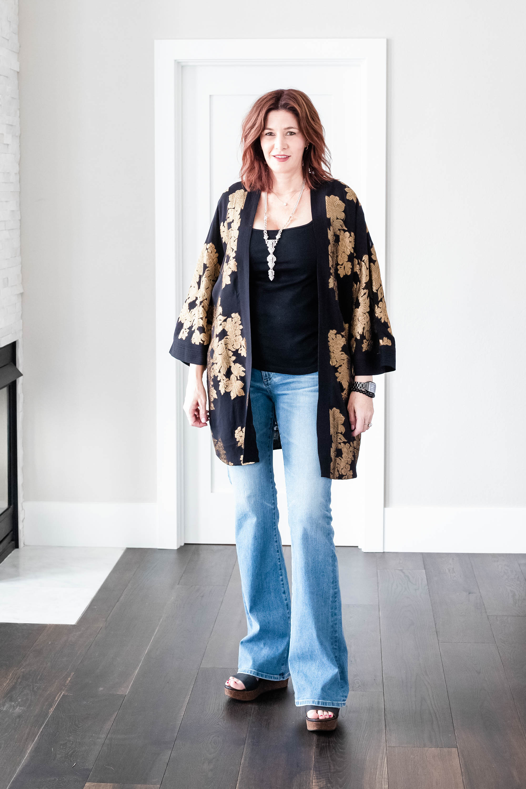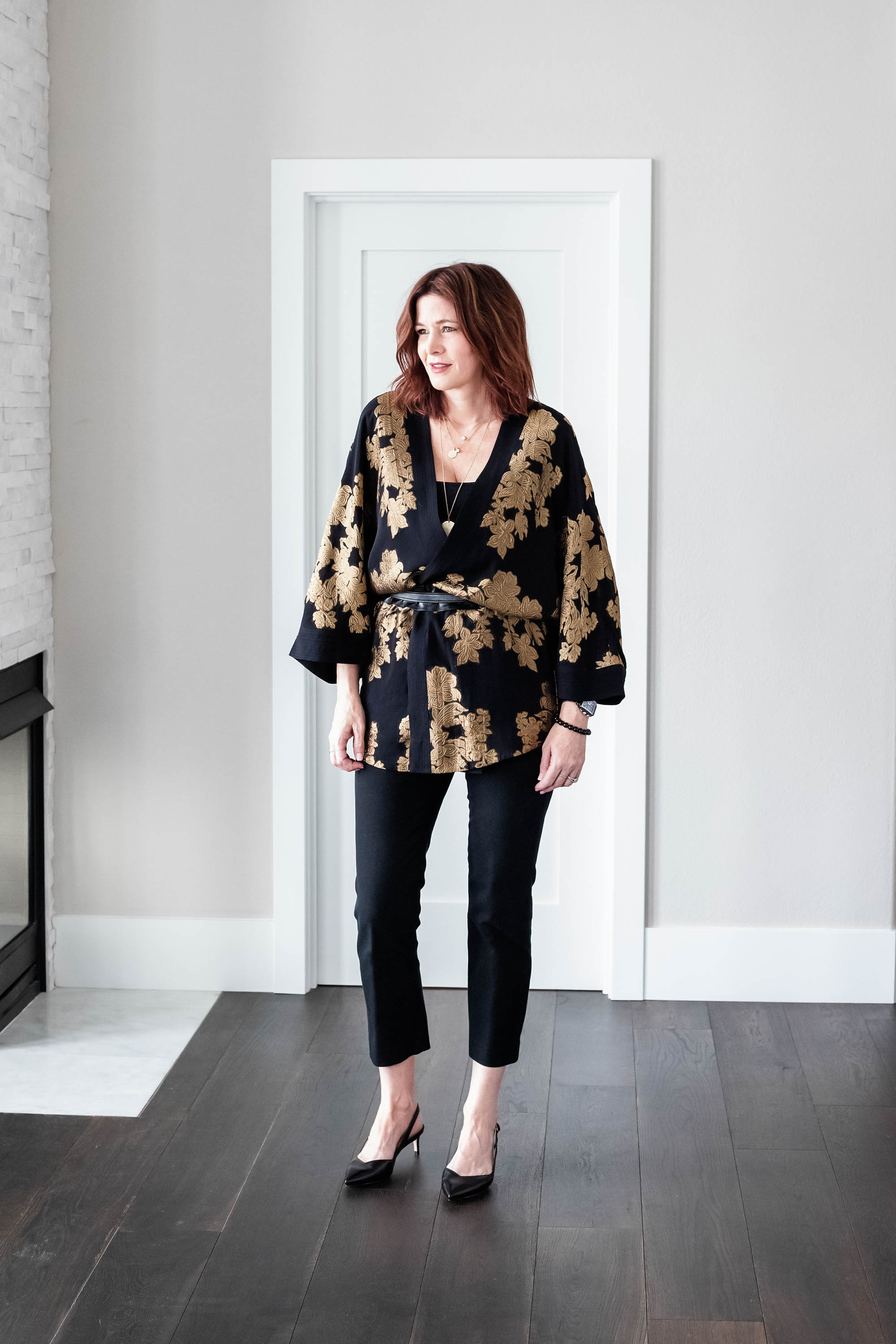 The two kimonos I chose are both from Anthropologie. The black and gold kimono, I picked up this winter. To get my hands on it, I stalked the Anthro web site as this kimono sold out almost immediately. A Small came back in stock and I snagged it. I figured I could get away with a small and I was right. I also had no idea where I would wear this dressy jacket but I knew it was something I need in my wardrobe.