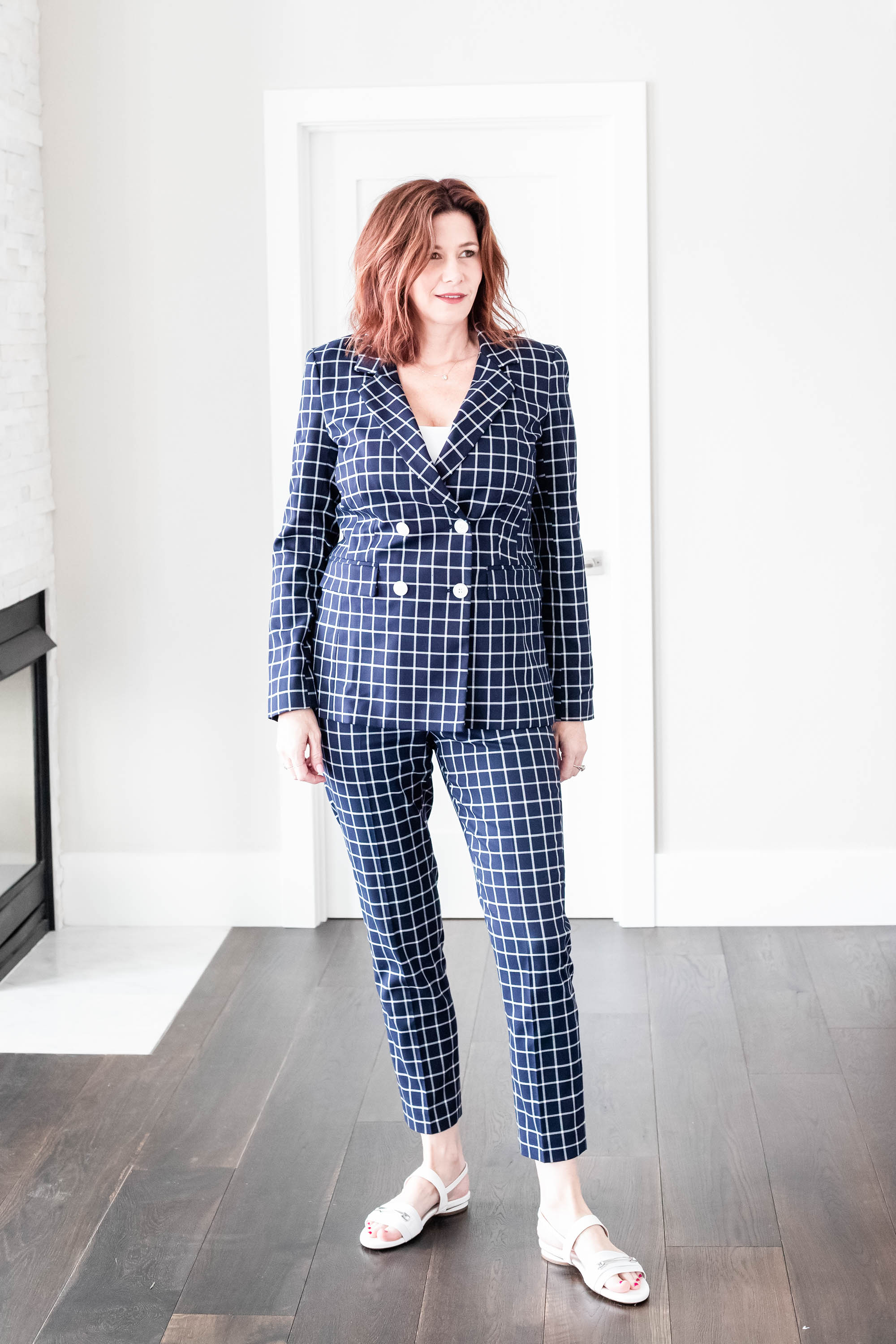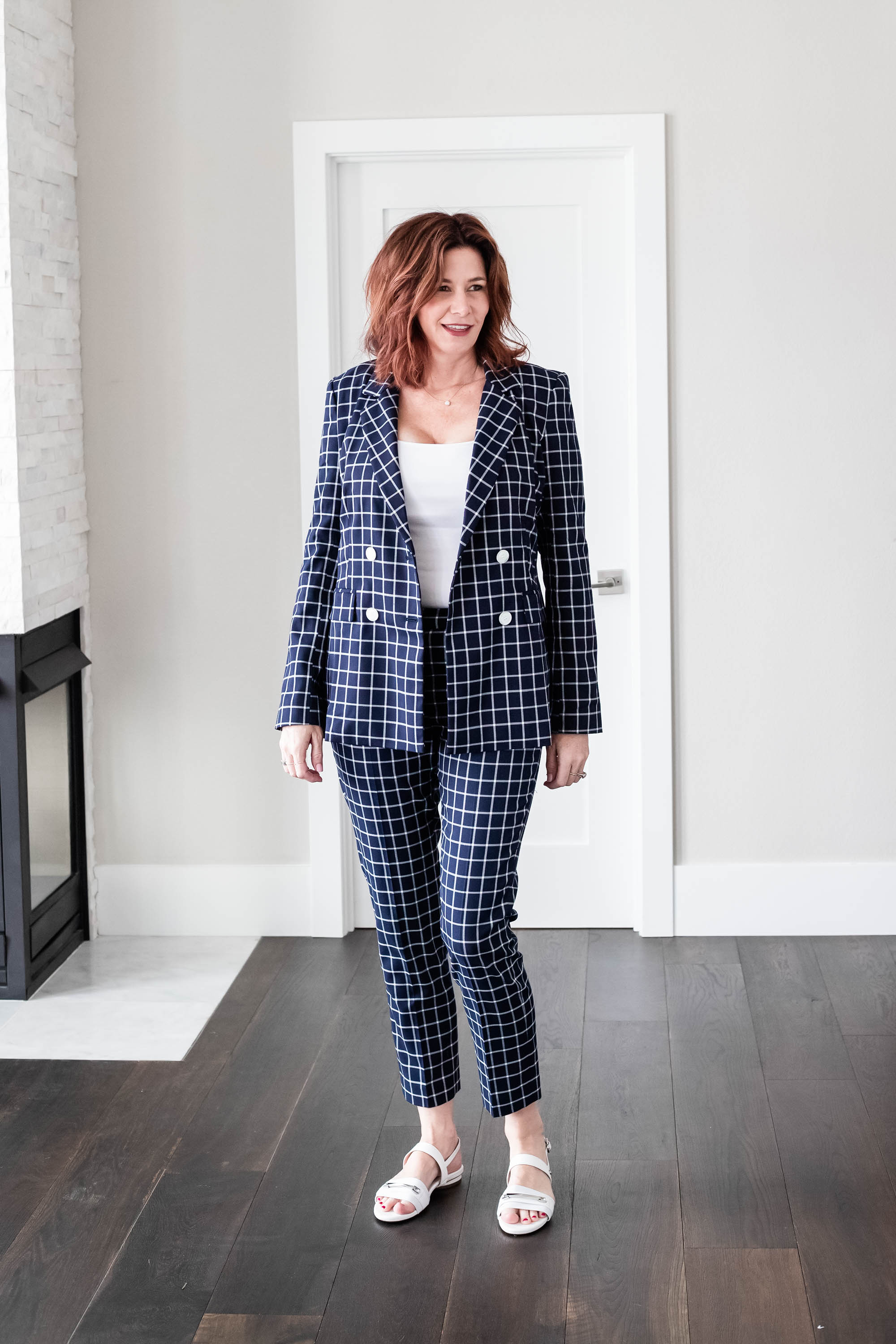 Today I am styling this super cute, Halogen plaid double breasted suit. A good double breasted suit can be worn either buttoned closed or open with your favorite camisole. I am wearing here with the J.Crew Slim Perfect Tank.