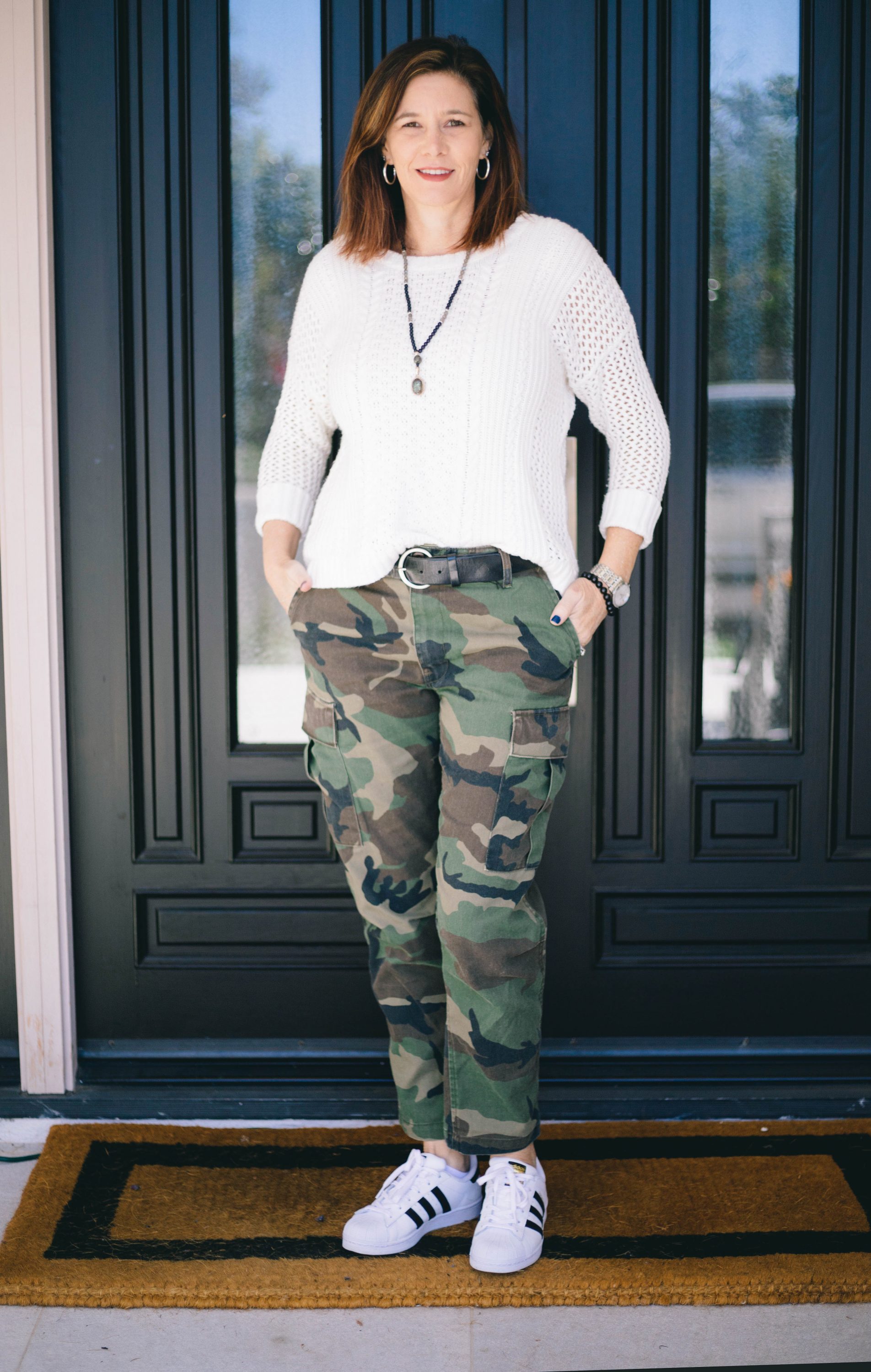 The middle pair of camouflage cargo pants are by Re/Done. They have a true army inspired vibe. I like cutting the hard edge of the pants with a softer top. Here, I am wearing a Madewell white sweater but I have also worn with black lace top. One of my favorite outfit combinations is hard edge/soft details.