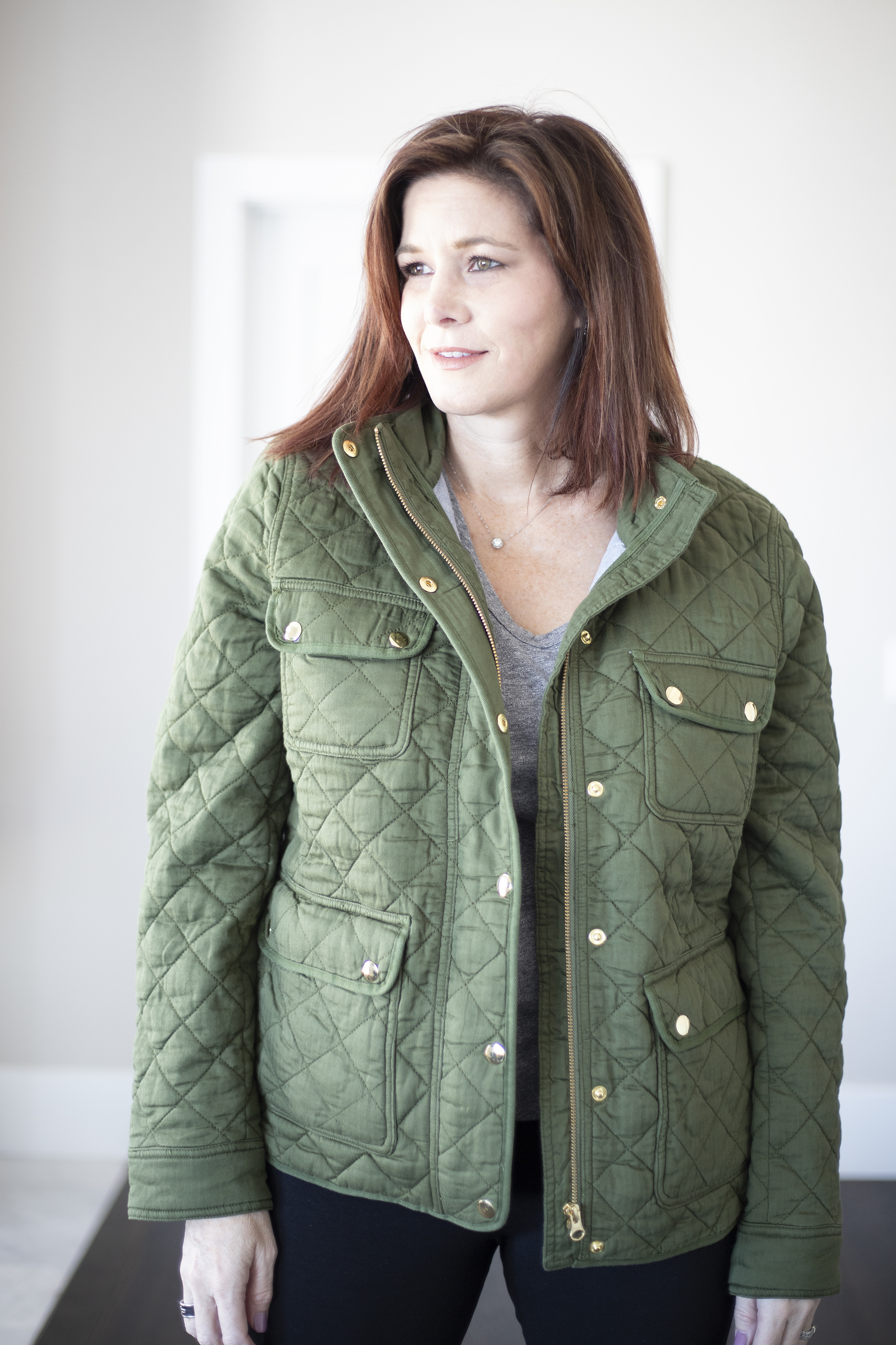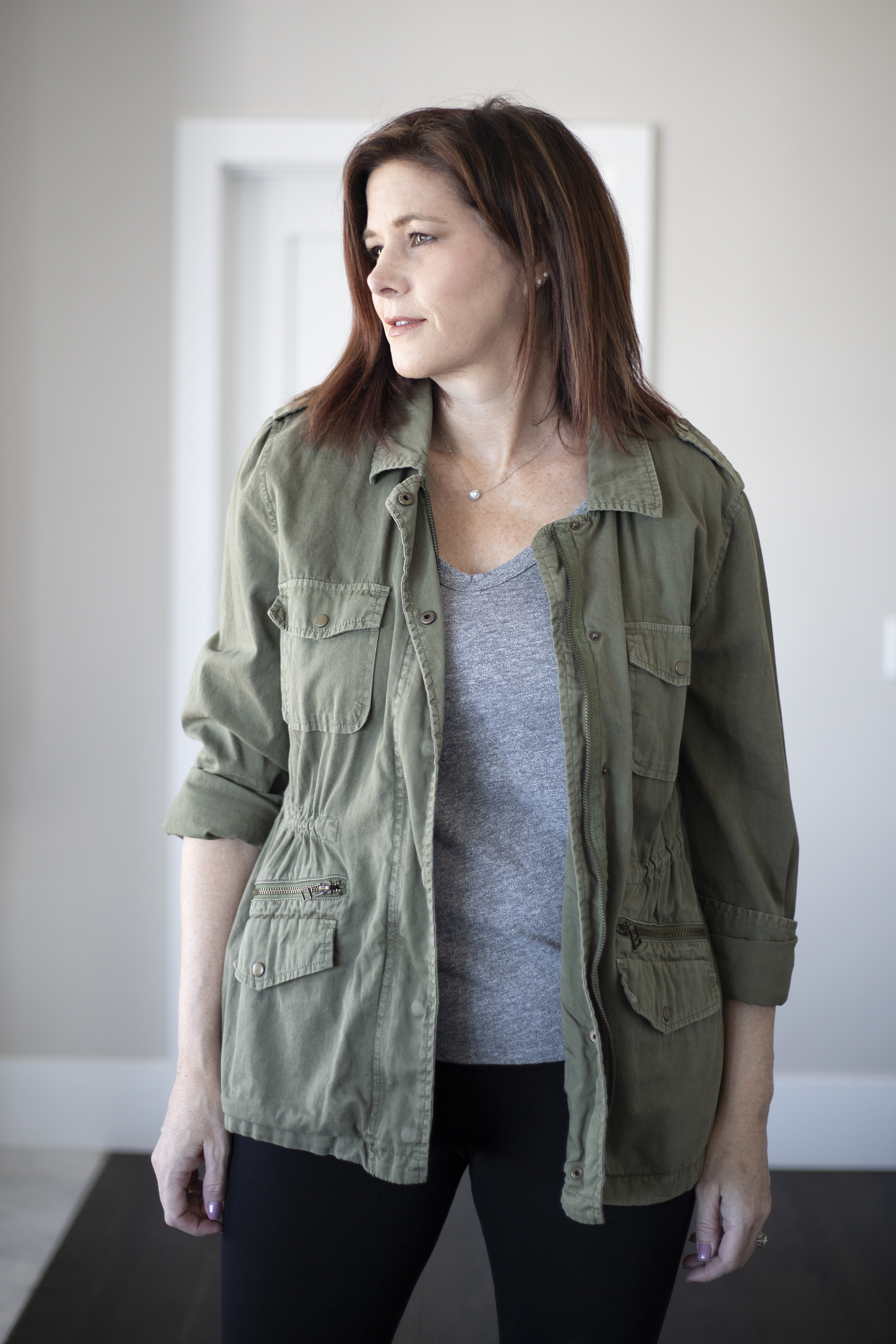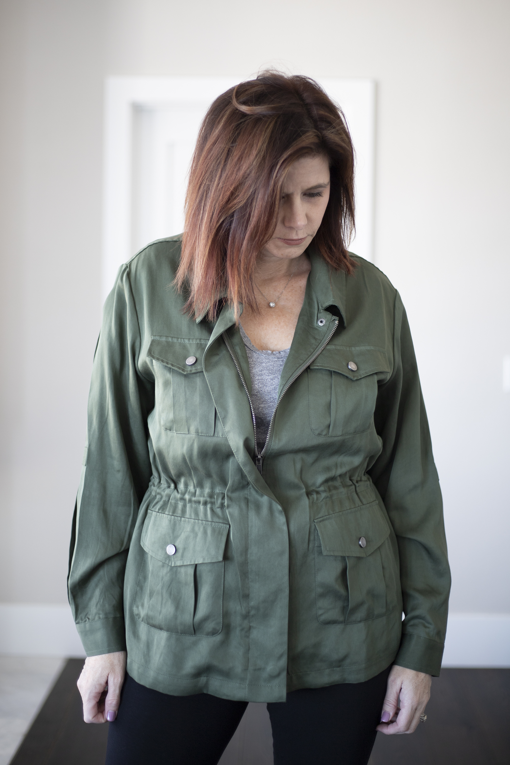 - Cut – You can find utility jackets in a multitude of different styles. I prefer a bit longer, almost, butt covering jacket but there are plenty of cropped options, if that is your jam. It probably goes without saying but the length of the coat can have a dramatic impact on how flattering it is on your body. For example, I cannot wear cropped styles because I have a short torso and long legs. Any time I wear a cropped jacket I look like I am wearing a child’s jacket. I also want a jacket to fall at the narrows part of my hips not the widest.