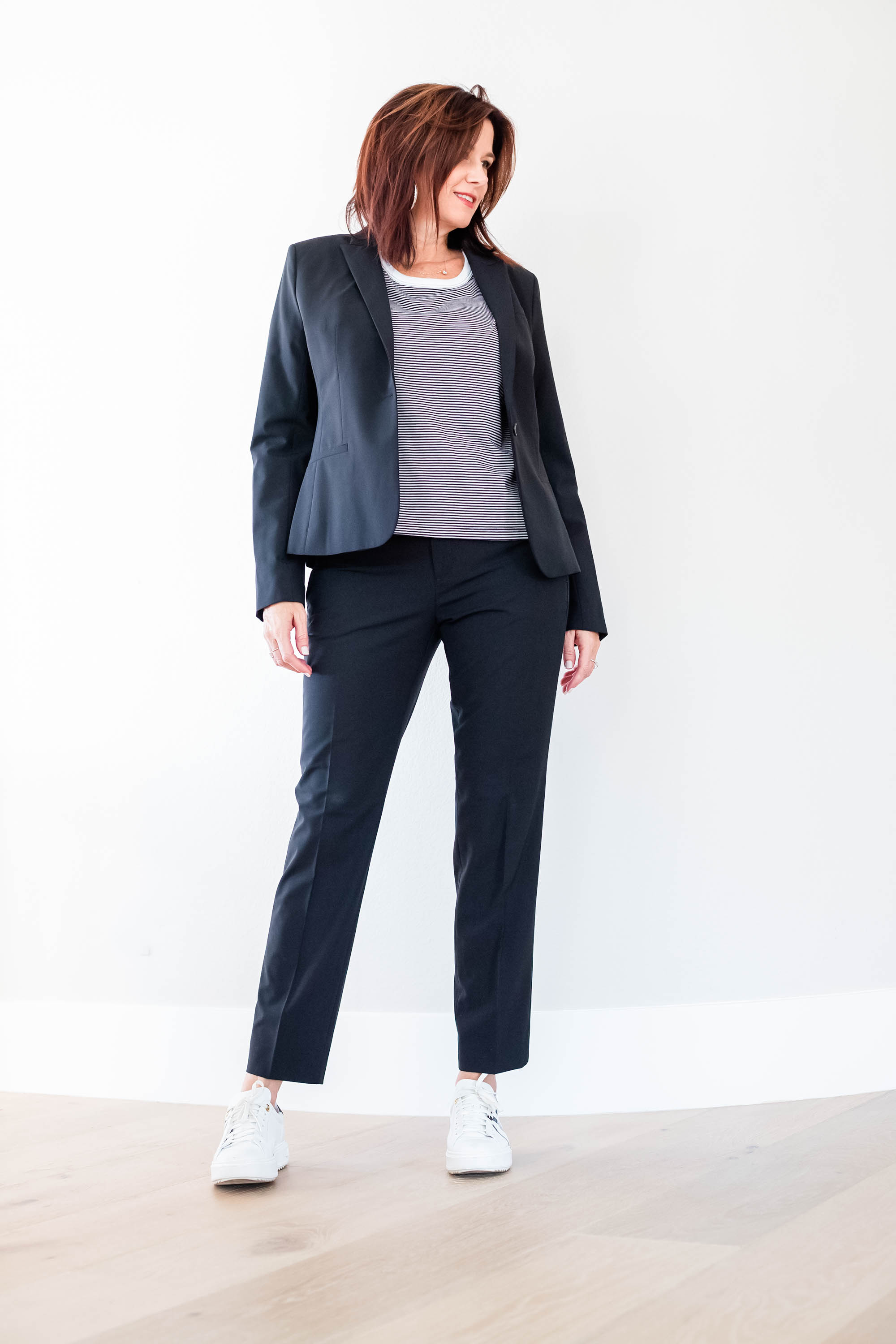 I finally settled on two suits: one from Banana Republic and one from J.Crew. I purchased the BR suit first, really wanting a grey suit but settling for black. Banana Republic has excellent sales so I picked the black to try and loved it. The suit is made from a special wool-blend that is machine washable. Score! The suit is light weight and will work fine here in San Diego throughout the winter but the J.Crew suit is better for colder climates.  I am wearing my usual 8 in pants but I sized up in the blazer to a 10 which I often do in blazers for a a little extra room and so I can layer other pieces underneath.