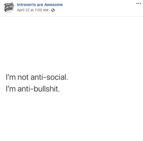 I also follow the Facebook group Introverts are Awesome. The group posts memes and other goodies, which remind me that my quirky personality is actually quite normal. Here are some of my recent favorites: