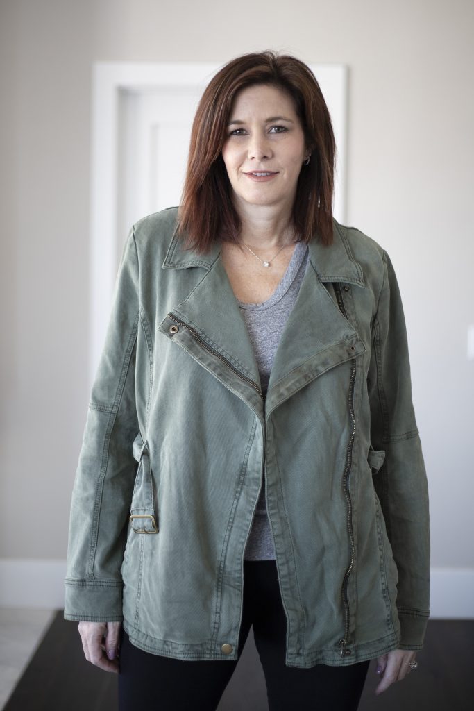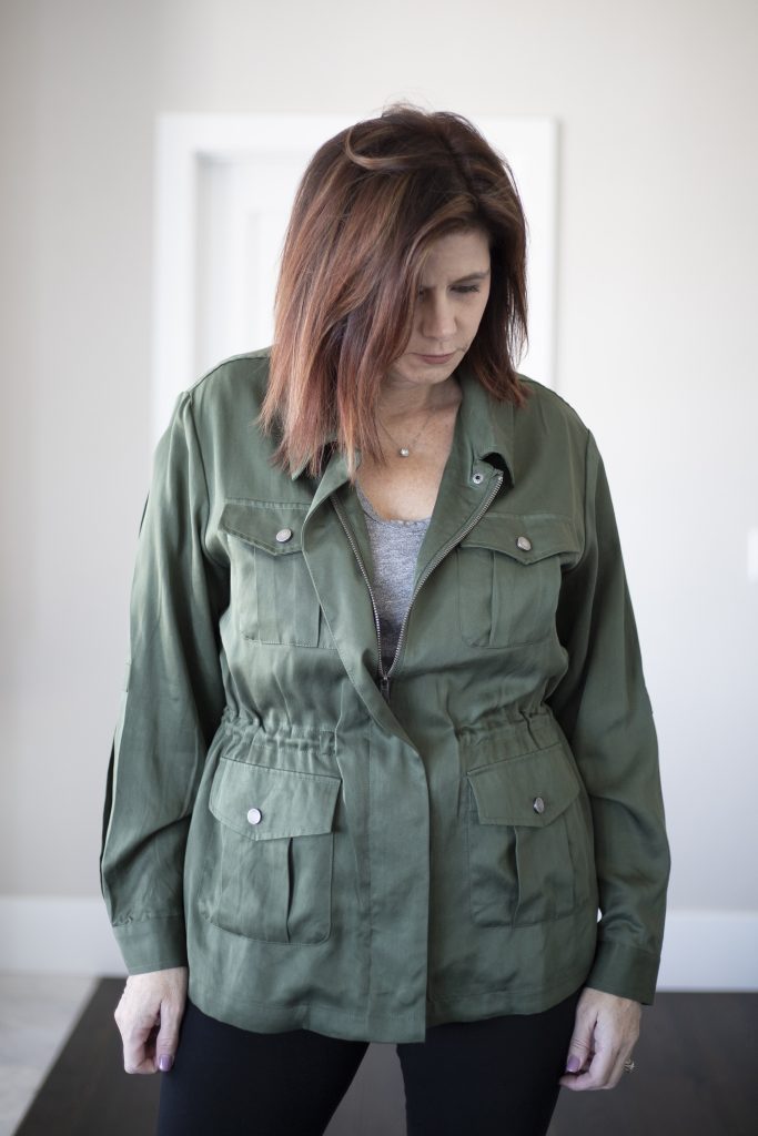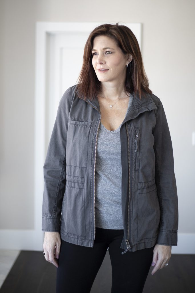 - Cut – You can find utility jackets in a multitude of different styles. I prefer a bit longer, almost, butt covering jacket but there are plenty of cropped options, if that is your jam. It probably goes without saying but the length of the coat can have a dramatic impact on how flattering it is on your body. For example, I cannot wear cropped styles because I have a short torso and long legs. Any time I wear a cropped jacket I look like I am wearing a child’s jacket. I also want a jacket to fall at the narrows part of my hips not the widest.