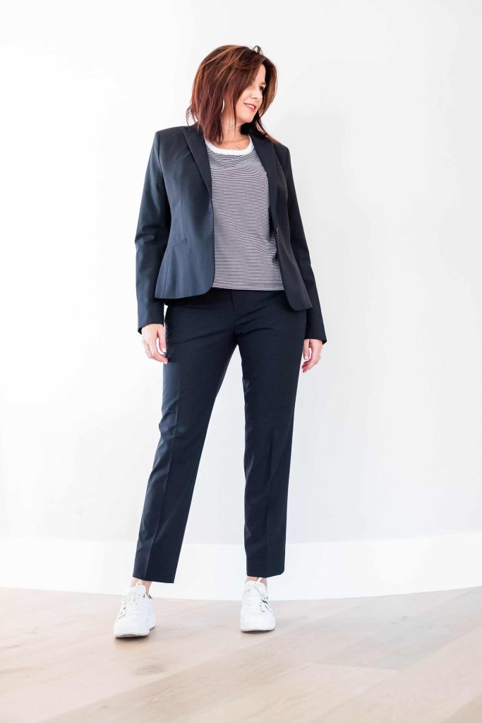 I finally settled on two suits: one from Banana Republic and one from J.Crew. I purchased the BR suit first, really wanting a grey suit but settling for black. Banana Republic has excellent sales so I picked the black to try and loved it. The suit is made from a special wool-blend that is machine washable. Score! The suit is light weight and will work fine here in San Diego throughout the winter but the J.Crew suit is better for colder climates. I am wearing my usual 8 in pants but I sized up in the blazer to a 10 which I often do in blazers for a a little extra room and so I can layer other pieces underneath.